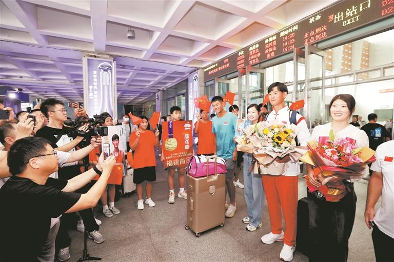 昨日14时左右,泉州动车站格外热闹,杭州亚运会福建首金得主陈弦峰的家人、朋友、启蒙教练,泉州市体育局领导等聚集在出站口,等待陈弦峰归来。