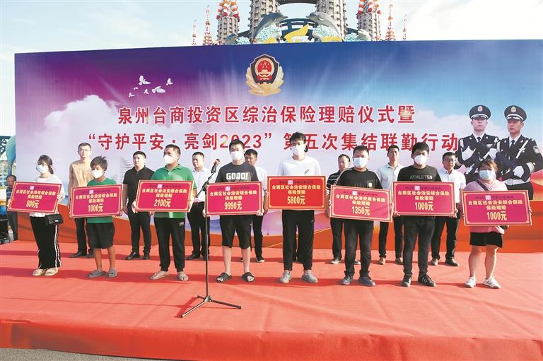 本报讯 (记者黄雅珊 通讯员阮雅君 文/图)“太感谢政府了,我们家因台风‘海葵’造成的损失挽回了一大半,我回去一定要好好向大家宣传下这个好政策。”9月26日下午,在泉州台商投资区综治保险理赔仪式暨“守护平安·亮剑2023”第五次集结联勤行动启动仪式上,张坂镇玉埕村村民骆先生接过1350元综治保险理赔金后激动地说道。在当天的综治保险理赔仪式上,共有8名群众现场领取2.3万元理赔金。