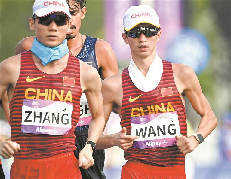 杭州亚运会“金牌大户”田径项目29日开赛。在当日早上率先进行的男女20公里竞走决赛中,中国选手张俊和王朝朝、杨家玉和马振霞分别包揽两个项目的冠亚军。图为张俊(左)、王朝朝在比赛中。(吴聪伟/文 新华/图)