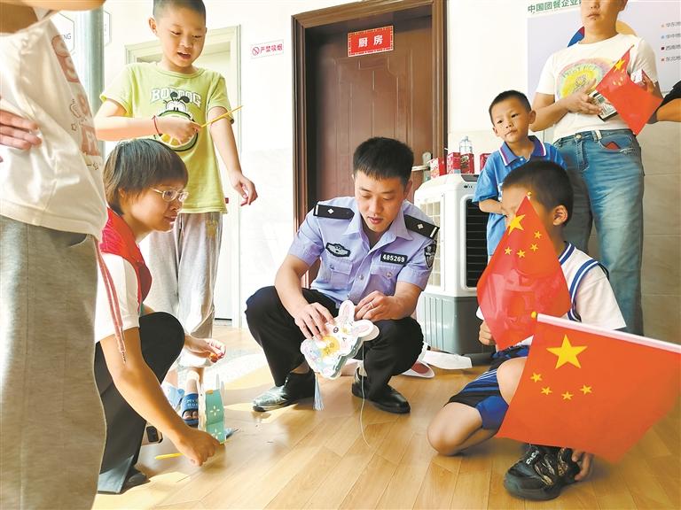 在乌殊村村委会,蓝田乡社工站社工向村里的孩子们介绍了中秋节的来历和习俗。随后,在民警和志愿者的帮助下,孩子们兴趣盎然地动手制作中秋节花灯。剪裁、折叠、粘贴,不一会儿,一个个色彩斑斓的灯笼便做好了。“警察叔叔,你看我做的花灯漂亮吗?”孩子们开心地向民警展示自己制作的花灯。
