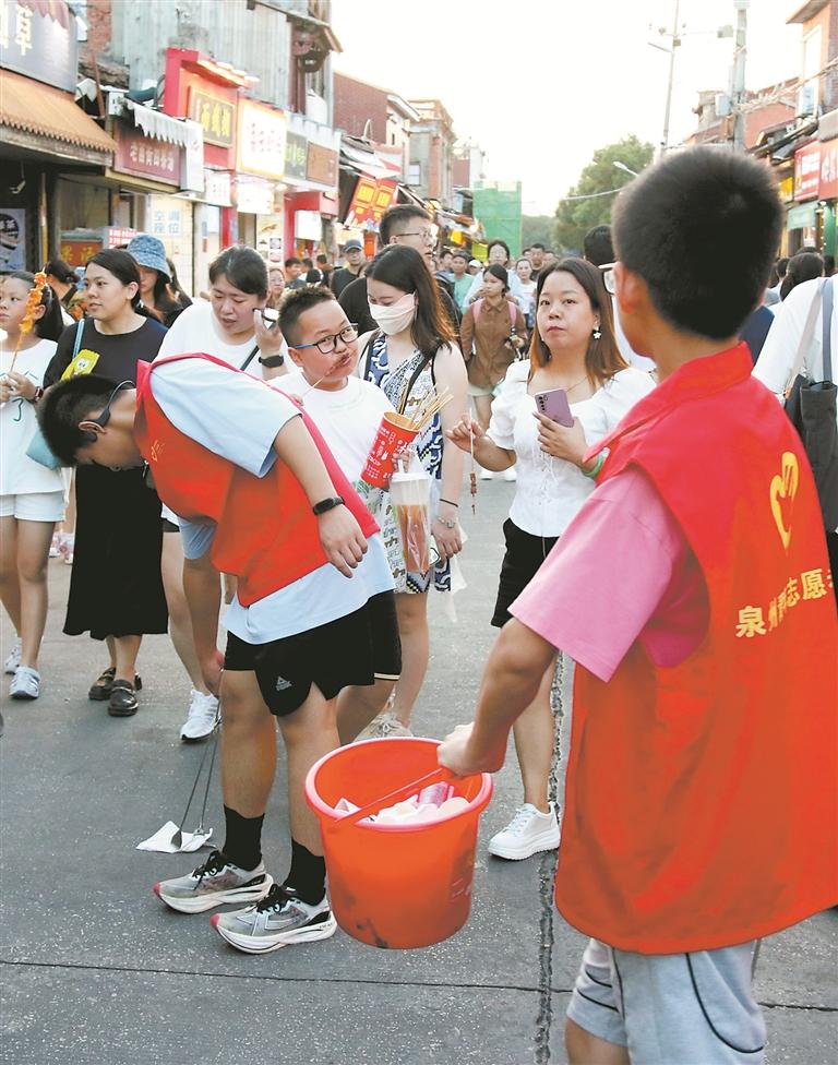 本报讯 (记者陈明华 文/图)中秋、国庆两节期间,泉州西街的游客人头攒动。绝大部分游客都能够文明旅游,但还是有个别人随手丢弃垃圾。在路面上的学生志愿者看到后,立即上前捡拾垃圾,维护环境卫生。