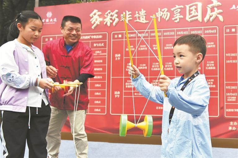 10月2日,小朋友在南京市民俗博物馆体验非遗项目抖空竹。(新华)