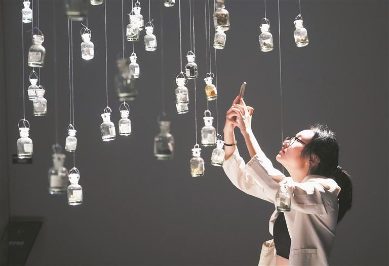 参观者在北京时代美术馆的《星河角落:步天歌》科学艺术展上拍照(新华)