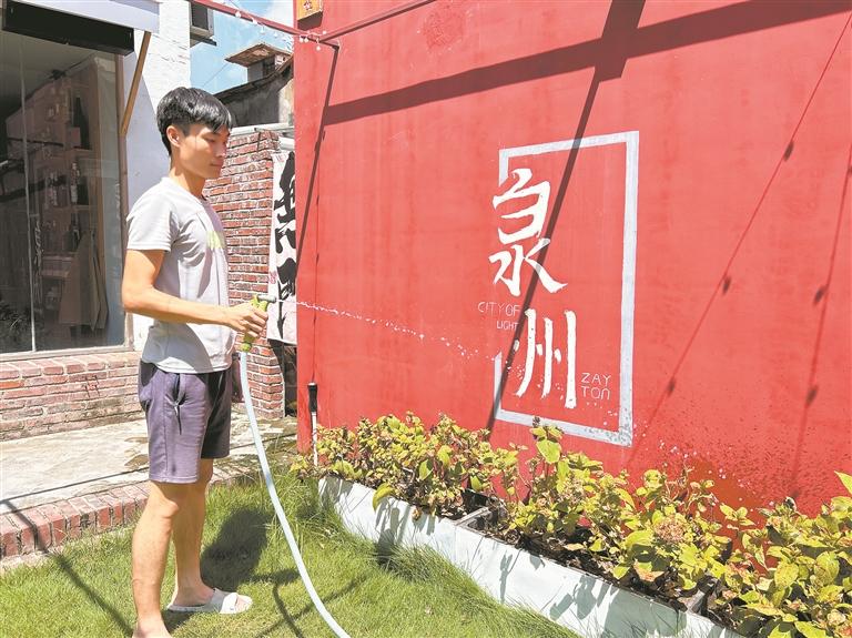 阿龙给院子里的植物浇水,他边生活,边深入地了解闽南文化。