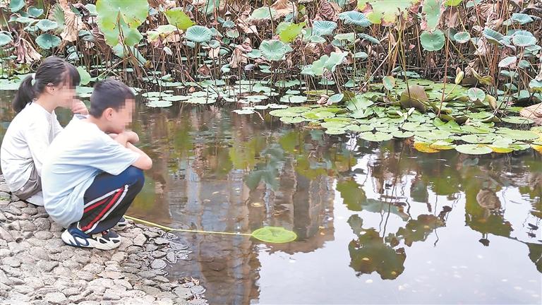 昨日下午,在泉州市区刺桐公园,有几名小朋友在池塘里用网兜抓小鱼。“请勿下池,谢绝垂钓。”池塘边醒目地立着一块告示牌,但仍有人视而不见。有的大人将馒头撕成小块,放在网兜里充当诱饵,接着让小朋友将网兜放进池内,等着小鱼游进网兜。在公园休闲锻炼的市民称,公园不是垂钓园,大人要起到好的榜样,而不是带着孩子来抓池塘里的鱼。(黄墩良 摄)