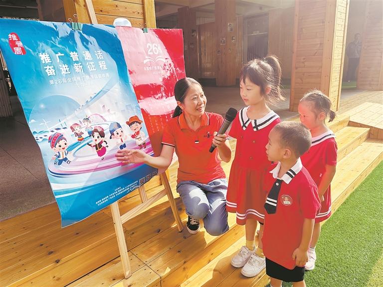 作为福建省语言文字规范化示范校,泉州市刺桐幼儿园开展了以“推广普通话 奋进新征程”为主题的一系列丰富多彩的推普宣传活动,与家长、幼儿携手构建文明和谐的语言环境。该园结合生动有趣的儿歌、木偶游戏等形式引领孩子们了解生活中使用普通话的作用和意义,体验普通话在日常生活中的重要性。