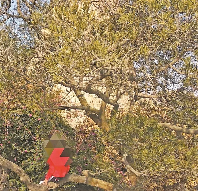 本报讯 (记者廖培煌 文/图)为了拍张好看的照片,小朋友不顾危险爬上树;到江边公园玩,发现滩涂有螃蟹,直接下去抓……国庆期间,记者在一些景点游览,偶遇一些不文明且危险的行为。