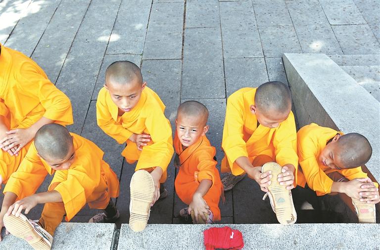 由于年龄太小,悟龙先被送到幼儿园上课,课余才和师兄们习武锻炼。悟铁今年8岁,平时跟随武僧们训练、习武。“悟铁和其他9位师兄弟都在学校上学。”释理刚介绍,武僧团里有不少孩子是适龄儿童,学习不能落下。