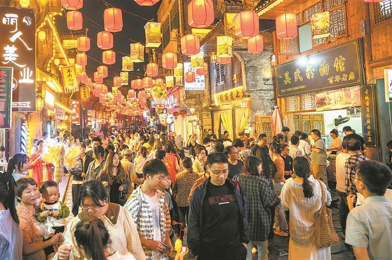 10月2日晚,游客在湖南新化县向东街游玩消费。(新华)
