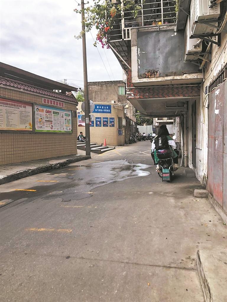 右图:鲤城区土地巷东门实验小学警务室旁边,楼上长期滴水,影响通行。(邓先生 摄)