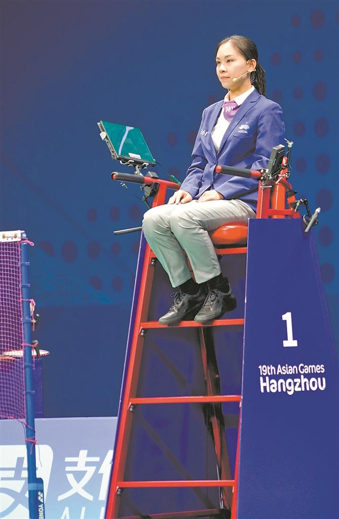 本报杭州电 (特派记者吴聪伟 文/图)7日晚,记者在杭州江滨体育中心体育馆见到了来自泉州的裁判员蒋诗颖。2小时前,杭州亚运会羽毛球男双决赛韩国选手对印度选手的比赛,蒋诗颖是场上的主裁判员。