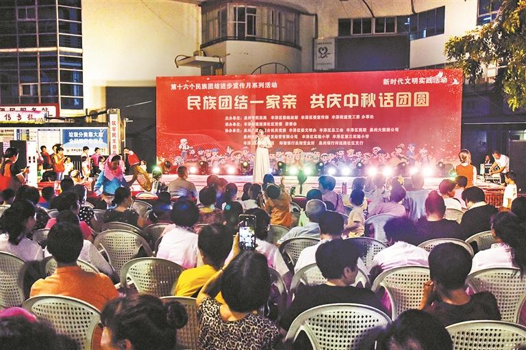 在第十六个民族团结进步宣传月期间,丰泽区举行“民族团结一家亲 共庆中秋话团圆”民族团结进步宣传暨庆中秋文艺晚会,吸引了300余名周边居民和各族群众代表前来观看。活动现场,舞蹈、古筝独奏、古诗吟唱、女生独唱……饱含民族团结元素的节目轮番精彩上演,以群众喜闻乐见的形式,宣传引导各族群众牢固树立中华民族共同体理念,进一步营造全国民族团结模范基地浓厚氛围。图为源淮社区老年学校的回族华侨郭秀玲正在演唱《我爱你,中国》。(陈庚嘉 摄)