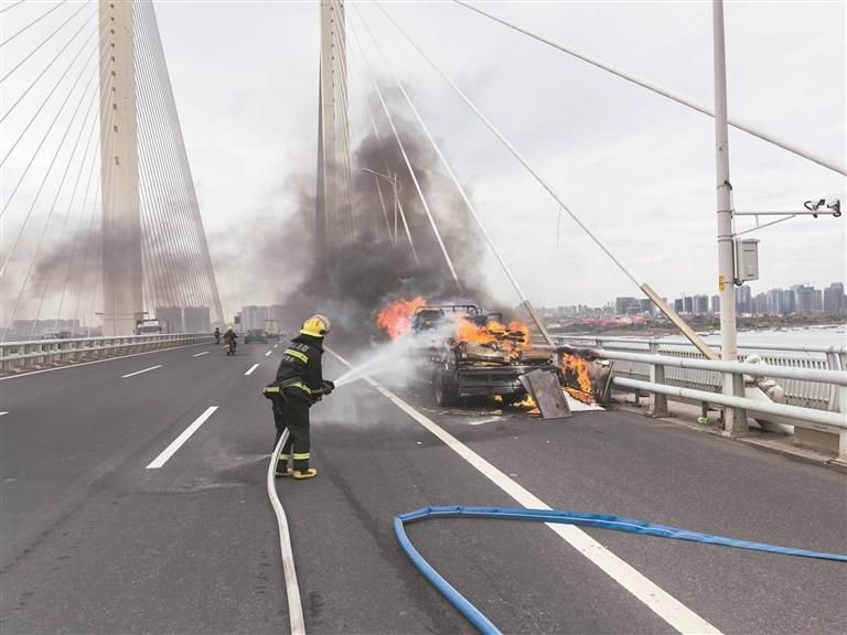 据司机介绍,当时他正在送货,途经大桥时周边车辆驶过告知其后方木板着火,他第一时间下车查看并报警求助。因处置及时,火势未造成人员受伤,具体原因正在调查中。