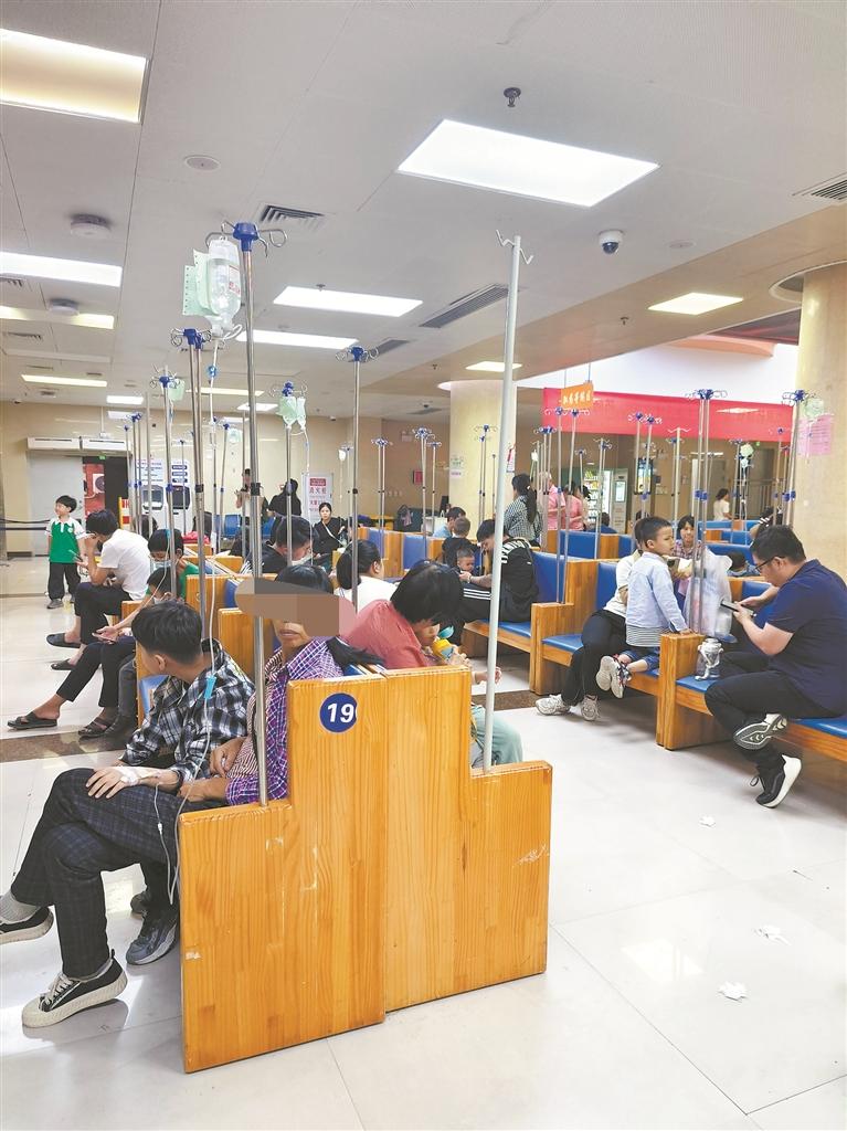 泉州市儿童医院一楼门诊大厅,不少孩子在接受输液治疗。