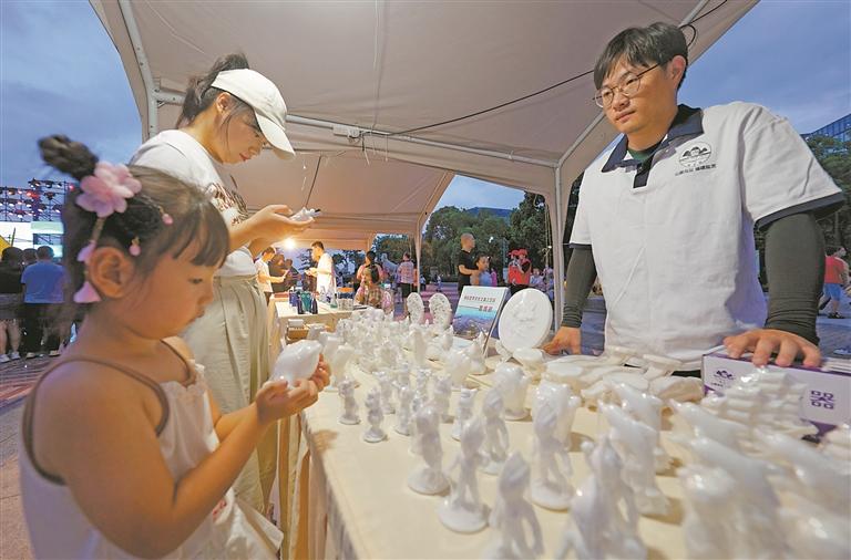 为满足游客多样化、多层次的文旅体验需求,泉港还将传统民俗文化与现代文创交融荟萃,一场国风集市同步在后龙土坑古民居开启。游客们穿梭集市逛吃乐玩,感受掌中木偶、施厝扁担、北管等非遗魅力,走进刘百万大厝围炉煮茶、制作花灯,在古色古香的绣花楼里描画古扇,零距离体验优质文旅产品。