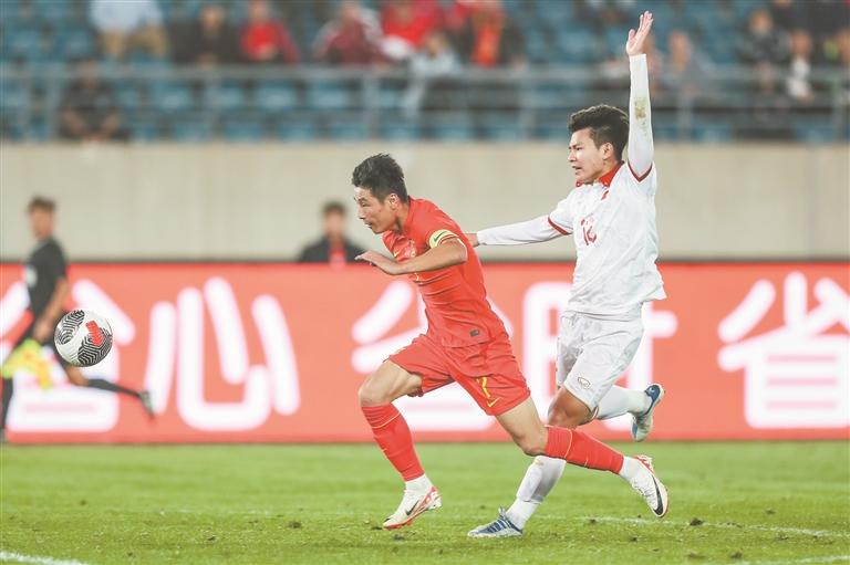 10月10日19:35,2023CFA中国之队·大连国际足球邀请赛中国国家队与越南国家队的比赛,在大连体育中心体育场进行。最终,中国队2∶0获胜。第34分钟,谭龙头球击中立柱;第56分钟,替补出场的王秋明接刘洋传中凌空垫射打入国足处子球;第89分钟,阮进玲被直红罚下;补时第8分钟,武磊锁定胜局。(网体/文 CFP/图)