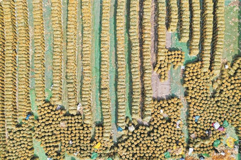 河北邢台市南和区河郭镇辛庄村一处秋粮晾晒收储点(10月10日摄,无人机照片)。