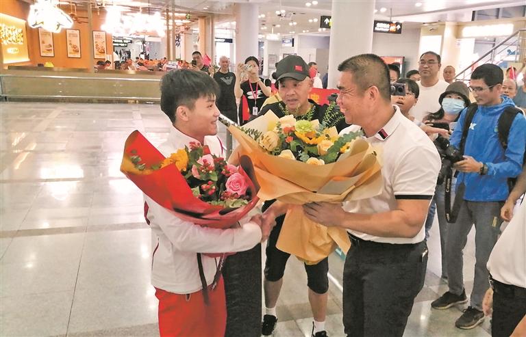 本报讯 (记者叶虹羽 范金林 吴聪伟 文/图)“热烈欢迎世锦赛、亚运会健儿林超攀载誉归来!”10月11日下午,泉州晋江国际机场人头攒动,杭州亚运会冠军林超攀的家人、朋友、启蒙教练等聚集在机场到达口,迎接林超攀的归来。刚下飞机的林超攀与家人和亲友们深深拥抱,手捧鲜花的他不断向大家致谢。