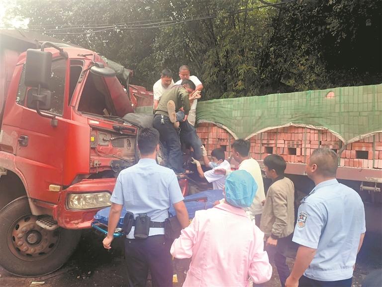 本报讯 (记者魏晓芳 通讯员陈家缘 许烽南 文/图)“警察同志,这里有人受伤了,你们快来!”10月11日7时许,安溪县公安局剑斗派出所接到群众报警称,在省道307仙荣村顶洋角落路段有两辆货车相撞,一名司机受伤。
