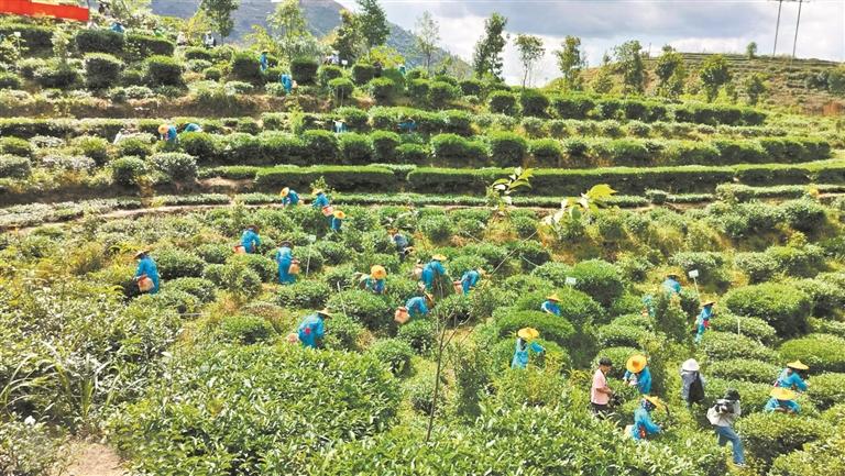 采茶工们正穿梭在茶园间,手法娴熟地采摘下最新鲜的“一芽三叶”。(邱宏伟 摄)