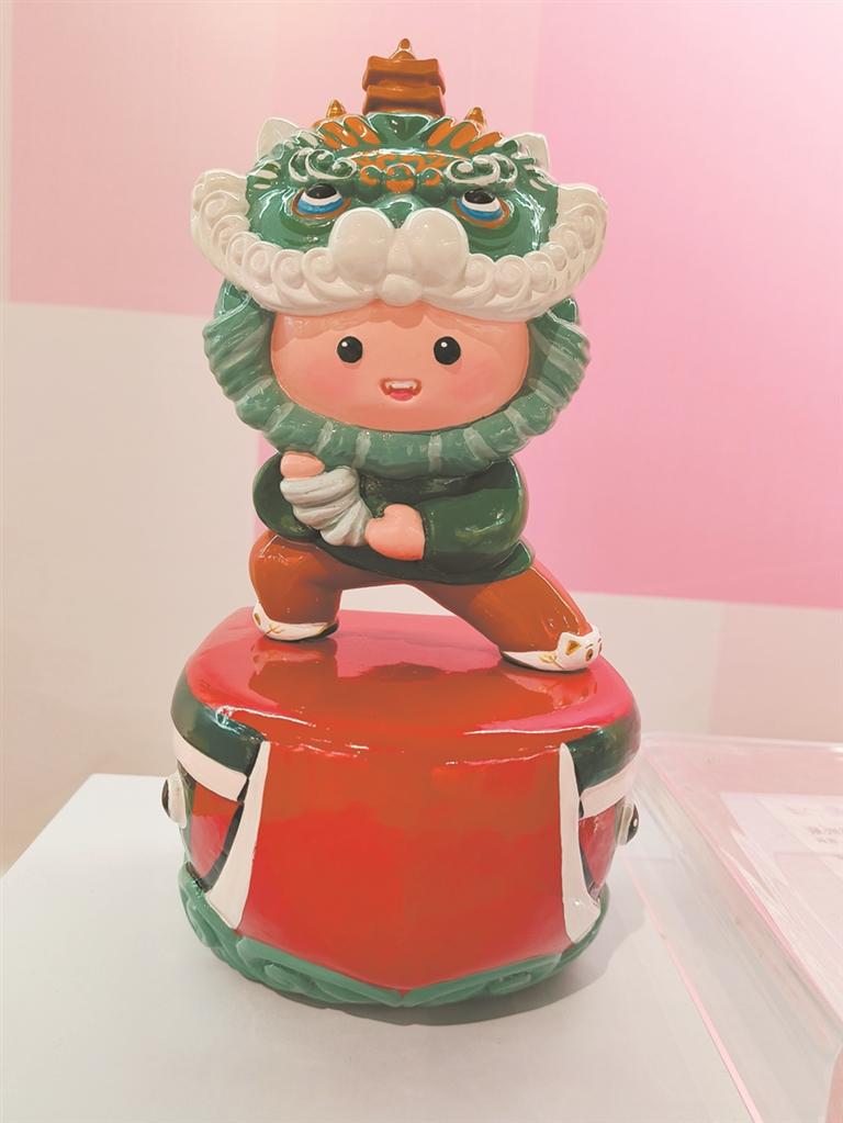 头顶姑嫂塔、东西塔,脚着狮头鞋,双手摆出泉州南少林功夫的“福狮娃”,灵气十足,憨态可掬。“希望通过‘福狮’与泉州在地文化的互动结合,作为一个支点展现这座古老城市的文化魅力。”设计师肖芸介绍:“本作品以泉州‘福狮’为主题,‘福狮娃’形象设计提取了泉州本地的元素,整体造型结合泉州南少林寺僧人的武功动作制作而成,穿的是狮头鞋,底座是一艘大福船,寓意乘风破浪。”