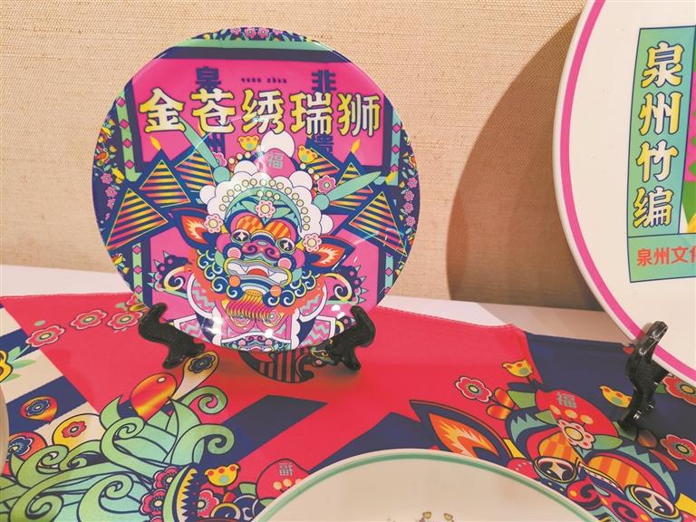 董锦以艺术设计为抓手,把地域传统文化、非遗技艺通过文化符号合理地运用在文创狮的产品设计当中。他表示:“用独具特色造型融合泉州的花灯、提线木偶、闽南居民营造技艺、金苍绣工艺、闽南建筑、竹编工艺、惠安女服饰文化、蟳埔女服饰文化等地域文化特色,我们通过潮流化、时尚化、视觉化的文创产品,传承和创新泉州的‘福狮’文化。”与此同时,设计师还将泉州福狮与日常物品相结合,创作出各类文创产品。比如,袜子、遮阳帽等衣物系列;桌布、创意碟盘等装饰品;帆布文具袋、文件袋等办公系列……这些既实用又充满文化气息的文创产品,让游客在游览古城的同时,也可以将属于泉州的记忆带回家。