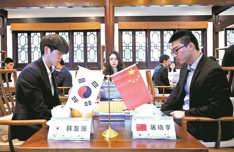 10月14日,2023年第五届中日韩聂卫平杯围棋大师赛在四川省成都市杜甫草堂开枰。此次比赛会聚中国、日本、韩国围棋名家大师,旨在促进中日韩三国围棋运动发展和体育文化交流。图为中国棋手屠晓宇(右)和韩国棋手韩友赈在比赛中。 (中新)