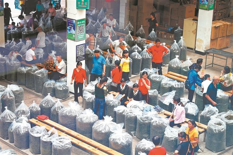 连日来,在安溪茶都茶叶交易市场,茶农将一袋袋茶香十足的新鲜秋茶摆上案台,供顾客挑选。据悉,今年秋茶产量略有上升,茶叶品质上乘,预计本月底全面上市。