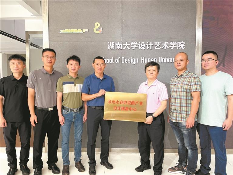 大胆“走出去”,阔视野拓思路。在前期充分调研的基础上,7月13日,永春县带队调研泉州市工业设计协会,双方就工业设计赋能永春多产业高质量发展深入交流。同日,考察泉州湖南大学工业设计与机器智能创新研究院并召开座谈会,就在永春设立研发创新平台、激活县域产业工业设计发展活力等议题展开深入讨论。7月26日,在泉州市科技局的带领下,永春县科技局组织永春国家香检中心、福建良瓷科技有限公司、永春百轩香业等赴湖南大学设计艺术学院考察学习,并在该院挂牌成立“泉州永春香瓷醋产业设计创新中心”,致力于推动永春县香、瓷、醋等传统产业工业设计能力的提升,实现产业创新发展、转型升级。