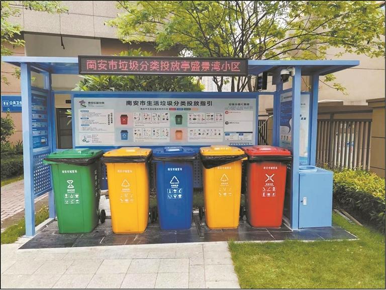 今年以来,南安有序推进2023年为民办实事项目,在市区新增30座生活垃圾分类屋(亭)。截至目前,该市市区已建设生活垃圾分类屋(亭)103座,有力促进垃圾的投放收集工作,让小区环境更加美观整洁。图为南安盛景湾小区垃圾分类投放亭。(柯仁杰 摄)