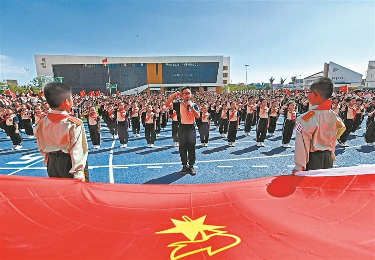 齐唱队歌、庄严宣誓……近日,泉港区举办“争做新时代好队员”纪念中国少年先锋队建队74周年主题队日活动,全区56所小学和特校的3167名秋季新生光荣地加入少先队。该活动通过庄严而又隆重的仪式,进一步激发广大少先队员作为时代新人的荣誉感、自豪感和使命感,同时树立远大理想,立志成为国家栋梁。图为在福建师范大学泉港实验小学里,少先队新队员在队旗下宣誓。(林弘梫 摄)