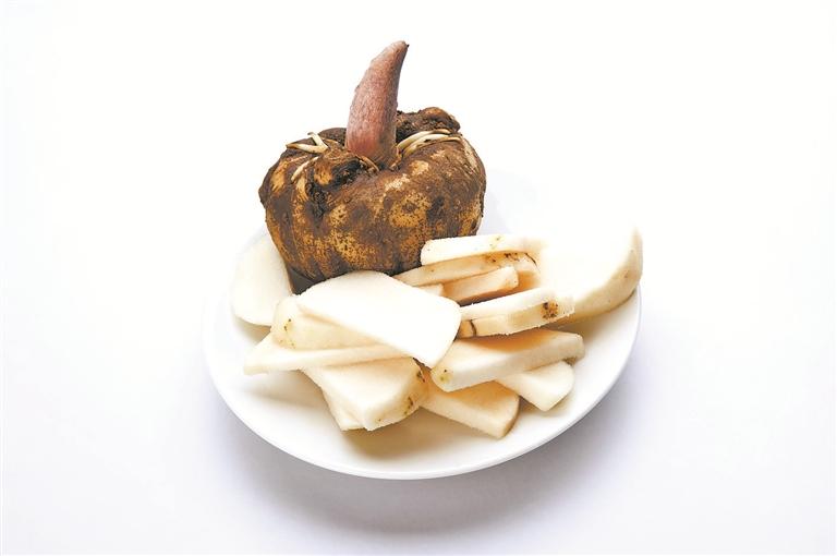 魔芋植株浅绿色的长圆形叶片长得极茂盛,在田间地头里随处可见,倒无出众之处;笔直的茎秆上长满白色或绿褐色斑块,乍一看,很像一条缠绕着的花斑蛇;球茎状的果实深藏在地里,外皮黑黢黢的,扁圆状的“球体”上布满小小的坑洼,中间瘪进去的地方凸起一根尖尖的红色芽头,模样看起来十分怪异,堪称果实界的“东施”。母亲说,魔芋生食有毒,必须经过加工制作后才能食用;若制作成功,吃起来就爽脆有弹性,是一道美食。我不禁想:魔芋如此极具“魔性”,它的得名是不是与此有关呢?