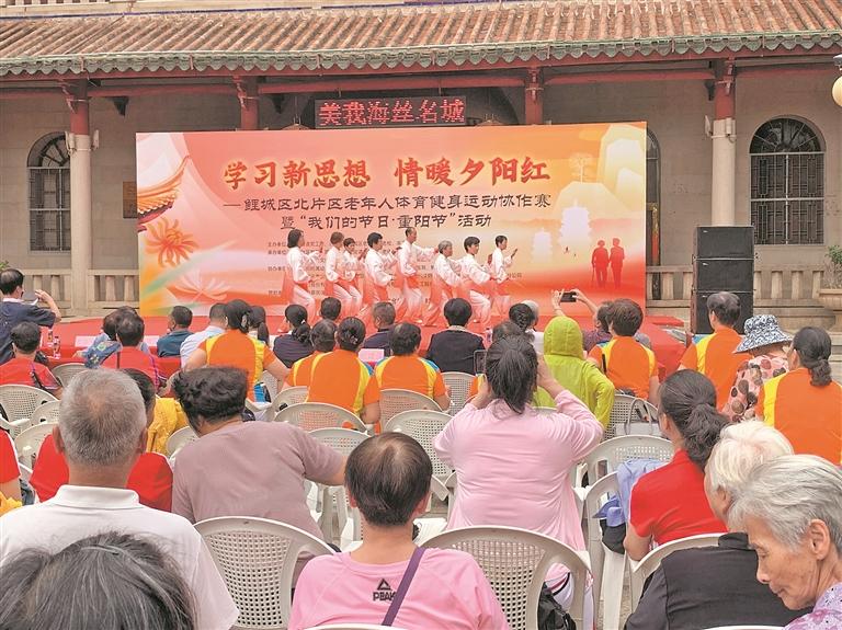 本报讯 (记者王丽虹 通讯员庄冬梅 文/图)昨日下午,鲤城开元街道联合区老体协等单位,在中心市区威远楼文化广场举行“学习新思想 情暖夕阳红”——鲤城区北片区老年人体育健身运动协作赛暨“我们的节日·重阳节”活动。