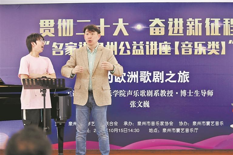 本报讯 (记者陈智勇)日前,由泉州市文学艺术界联合会主办,泉州市音乐家协会承办的“贯彻二十大,奋进新征程‘名家进泉州’公益讲座(音乐类)——《我的欧洲歌剧之旅》张文巍教授大师班”在泉州市寰艺音乐厅举行。