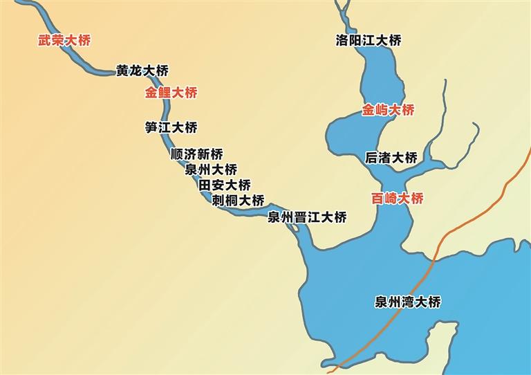一座座跨江大桥的建设和投用,将进一步加强各大城市组团间的联系,为环湾发展注入新的动力。截至目前,泉州市区已建成通车9座现代化跨江桥梁(不含高速公路桥),分别是跨越晋江的泉州晋江大桥、刺桐大桥、田安大桥、泉州大桥、顺济新桥、笋江大桥、黄龙大桥,跨越洛阳江的后渚大桥、洛阳江大桥。 □本报记者 王金植 实习生 谢丽丽