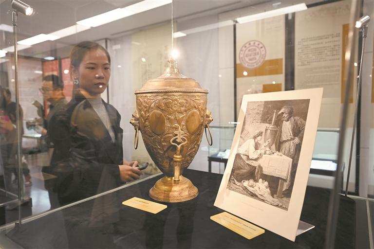 10月17日,历史的动脉——“一带一路与万里茶道”实证研究成果汇报展在北京开幕。展览共分为世界茶故乡、茶道通万里、共饮一杯茶和复兴在路上四个部分,用500余件(套)文物讲述了万里茶道以及中国茶联通世界、兼收包容的历史。图为观众参观展出的俄罗斯镀银茶炊。(新华)