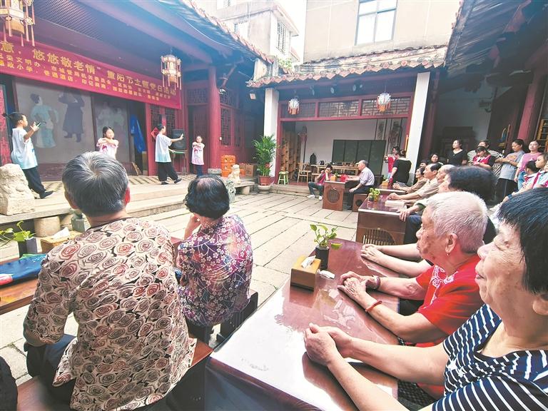 上午9时许,伴随着悠扬的音乐声,通政小学4名小朋友手持绿伞款款走上舞台,为台下的老人和其他观众献上一段精彩的梨园戏表演。台下的老爷爷老奶奶专心致志地看着表演,脸上露出满足的微笑。