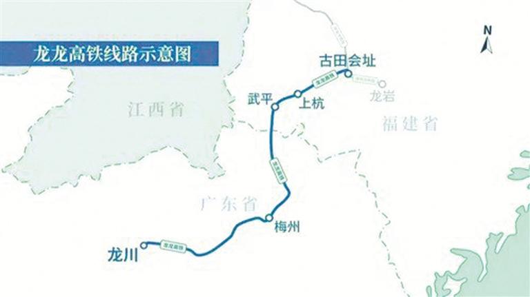 龙龙高铁是福建连接广东的重要铁路通道之一,是国家《中长期铁路网规划》建设项目,其东起福建省龙岩市,途经上杭县、武平县进入广东省境内,终到河源市龙川县,线路全长265.5公里,其中福建境内全长92.7公里,利用既有赣瑞龙铁路28.4公里,新建线路全长64.3公里。龙岩至梅州段时速250公里、梅州至龙川段时速350公里,分龙岩至武平段、武平至梅州段、梅州至龙川段三段分期实施。其中,福建境内设龙岩、古田会址、上杭北、武平4座车站,其中龙岩站为既有车站,古田会址站为既有车站改扩建,其余为新建车站。龙龙高铁福建段于2019年9月开工建设,预计2023年年底具备开通运营条件。