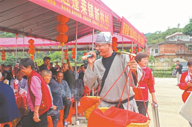 不一会儿,伴随着乡贤王荣川演唱的闽南语歌曲《蚵仔面线》,令人期待的“百叟宴”正式拉开帷幕。王荣川身穿古装,肩挑箩筐,边唱边与老人们互动。“这里准备了一些糖果,祝福大家身体健康、生活甜蜜。”见他走到身边,不少老人纷纷上前抓一把糖果,像孩童般开心得不得了。