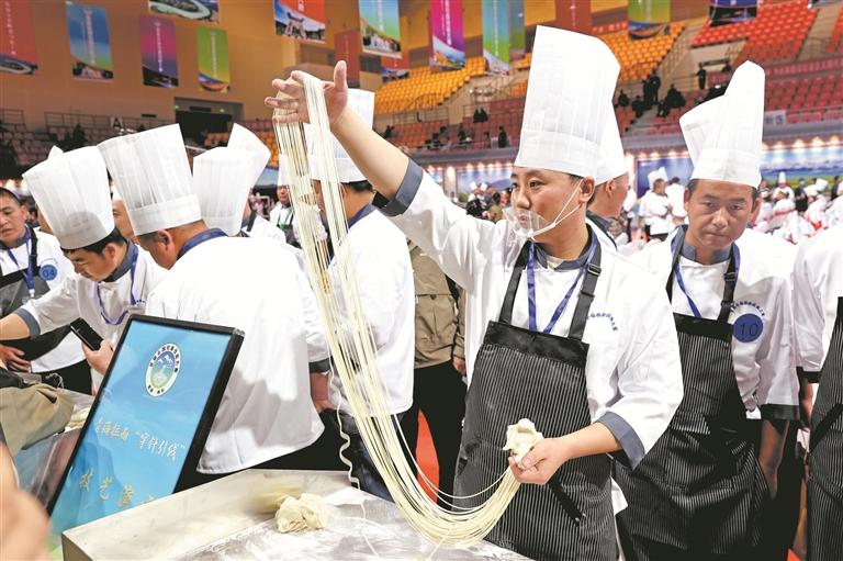 10月21日,首届全国拉面技能大赛在青海省海东市举办,全国200余名选手参加比赛。 图为参赛选手在进行拉面基本功环节的比赛。 (中新)