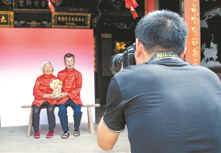 近日,为给金婚伉俪们定格夕阳美,泉州市文联、南安市文联、英都镇人民政府联合组织20名专业摄影家为110对金婚以上的老夫妻免费拍照留影。活动现场,只见一对对银发夫妻身着红色唐装,或拿鲜花,或握国旗,或提“福”字,脸上露出开心的笑容。“活动主要采取集中拍照的形式,拍摄点是全国重点保护单位英都坂埔古厝,让老人家有归属感,又见证群众生活巨变”,泉州摄影家协会主席洪宗洲介绍,除了集中拍摄,还安排一组摄影家,为行动不便的夫妻提供上门拍照服务,让他们感受到党和政府的温暖。(黄小燕 黄耿煌 摄)