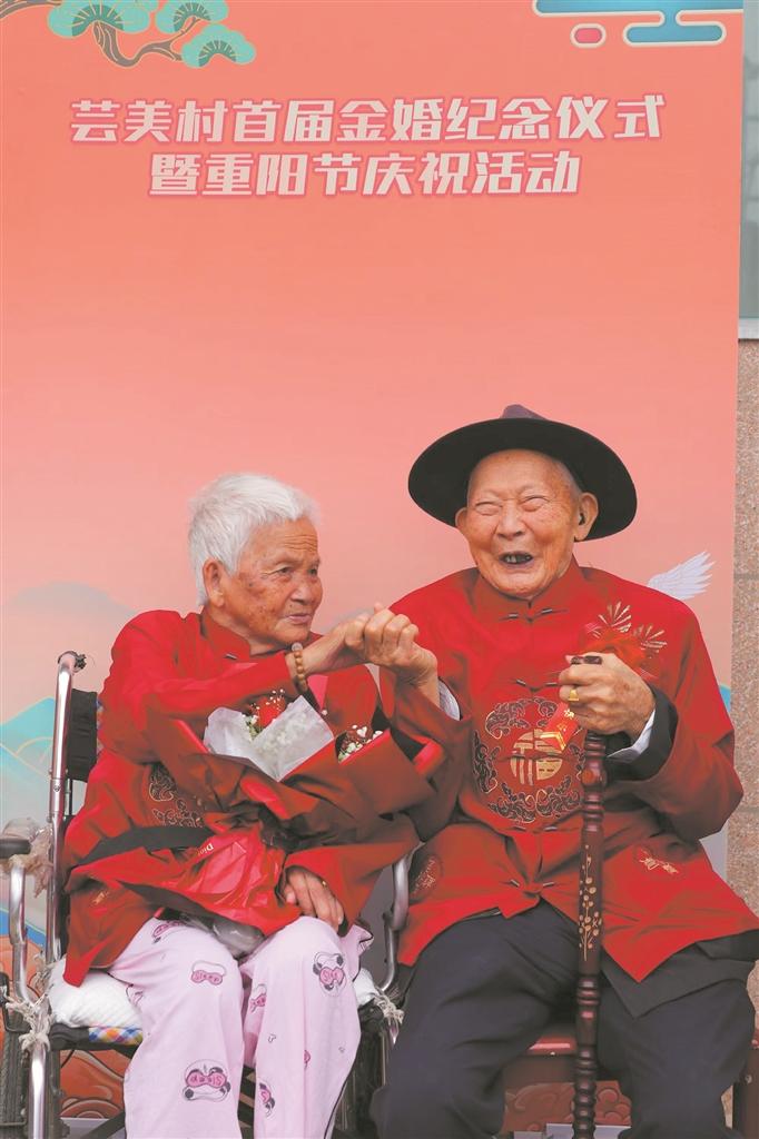 当天上午,受邀的金婚老人早早来到现场。他们换上村里为其购置的中式礼服,相互整理着服饰。在拍合照环节,老人们面带笑容,手捧鲜花依偎在一起,摄影师则用镜头帮他们定格下一个个甜蜜温馨的画面。