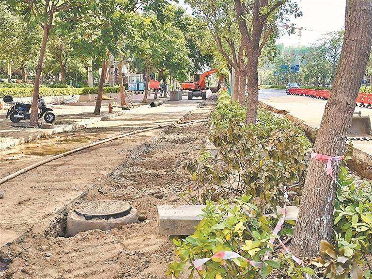 记者走访看到,东海泰禾首玺小区正大门前的大兴街已经整段被挖开,身着水务集团工作服的工作人员正在现场作业。而在通港西街宝珊花园小区前,两侧的人行道也已破开,工地旁进行了围挡,现场告示牌写着:“彩虹沟排口应急整治项目正在进行中,9月8日开始到10月30日完成。”通港西街及大兴街等路段的改造正是属于彩虹沟两侧截污改造工程路段。