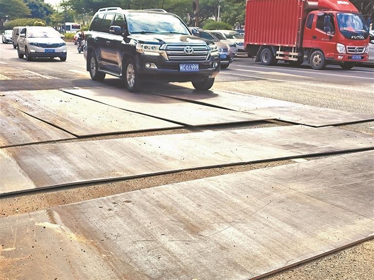 “最近小区楼下昼夜响个不停,已经持续了整整一周。”昨日上午,市民陈先生致电本社24小时热线96339反映,他所住的东海泰禾首玺小区近期周边都在破路施工,令小区居民纳闷的是,除了破路时的扰民,有一处路面挖开后铺了6块铁板,这些铁板不仅翘起存在危险,车辆经过时更是“哐当”作响,而且已经持续了一个多礼拜。□本报记者 张晓明 文/图