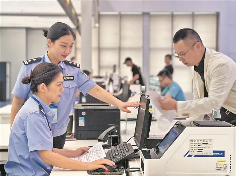 “一段时间来,我们窗口业务量猛增,且高峰持续时间较长。”出入境管理大队党员民警郑光焰告诉记者,为应对持续攀升的办证需求,全力保障出入境管理服务工作,出入境管理大队党支部提前部署,分析评估办证量,精心制定应急工作预案,采取了延时服务等一系列措施,方便服务群众。