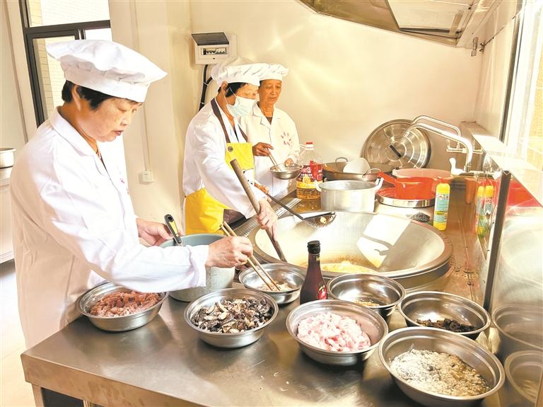 三人无须多言,配合默契,仅约一个小时就完成七八道菜肴。11点多,老人们开始用餐,忙碌了一上午的她们也脱下厨师“装备”和大家一起吃饭。记者看到,桌上有玉米排骨汤、红烧肉、白切鸡、卤面、海蛎面线、清炒蔬菜等,荤素搭配合理,营养又美味。饭后,她们还要洗碗盘、收拾厨房才回家。