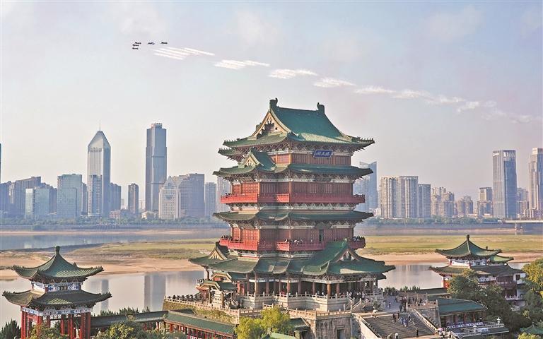10月24日,2023中国航空产业大会暨南昌飞行大会组织空军航空大学“红鹰”飞行表演队与欧洲环球之星特技飞行表演队,驾驶飞机在南昌市区上空进行了特技飞行表演,飞越滕王阁上空。 (新华)