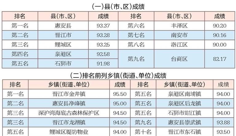 本报讯 (记者杜婉琼 通讯员黄昱颖)9月份,市城市管理综合考评中心对全市海岸带(近岸海域和海岸线向陆一侧200米的陆域)的环境卫生情况开展考评。其中,在各县(市、区)成绩中,惠安县取得第一名。从各镇(街道)成绩来看,晋江市金井镇取得第一名,晋江市东石镇排名第十。