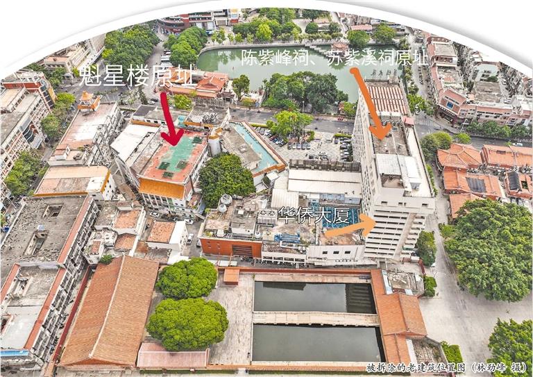 林胜利回忆,距离魁星楼不远处的是陈紫峰祠、苏紫溪祠,小时候两个祠堂曾作为粮站使用,后来拆除建起了一座职工礼堂。1978年,职工礼堂被拆除,在其位置建起了新的华侨大厦。