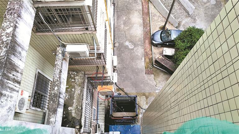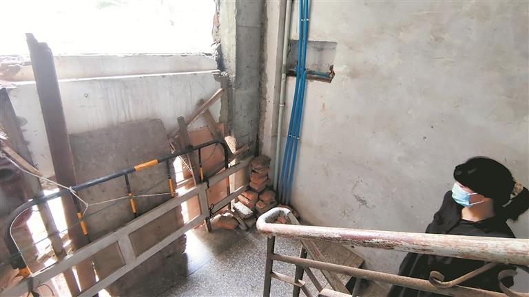 加梯工程位于企塘花园C幢3梯和E幢的拐角处,抬眼望去,可以看到E幢二楼的阳台外侧安装着一个大型空调室外机,三楼到六楼的阳台外侧均安装了空调外机或三角铁架。在C幢3梯楼梯转台,墙壁已被挖开面积不小的窟窿,原计划用于连接电梯,结果电梯一直未能完工,居民们只能用木板和防护栏将窟窿遮挡住。